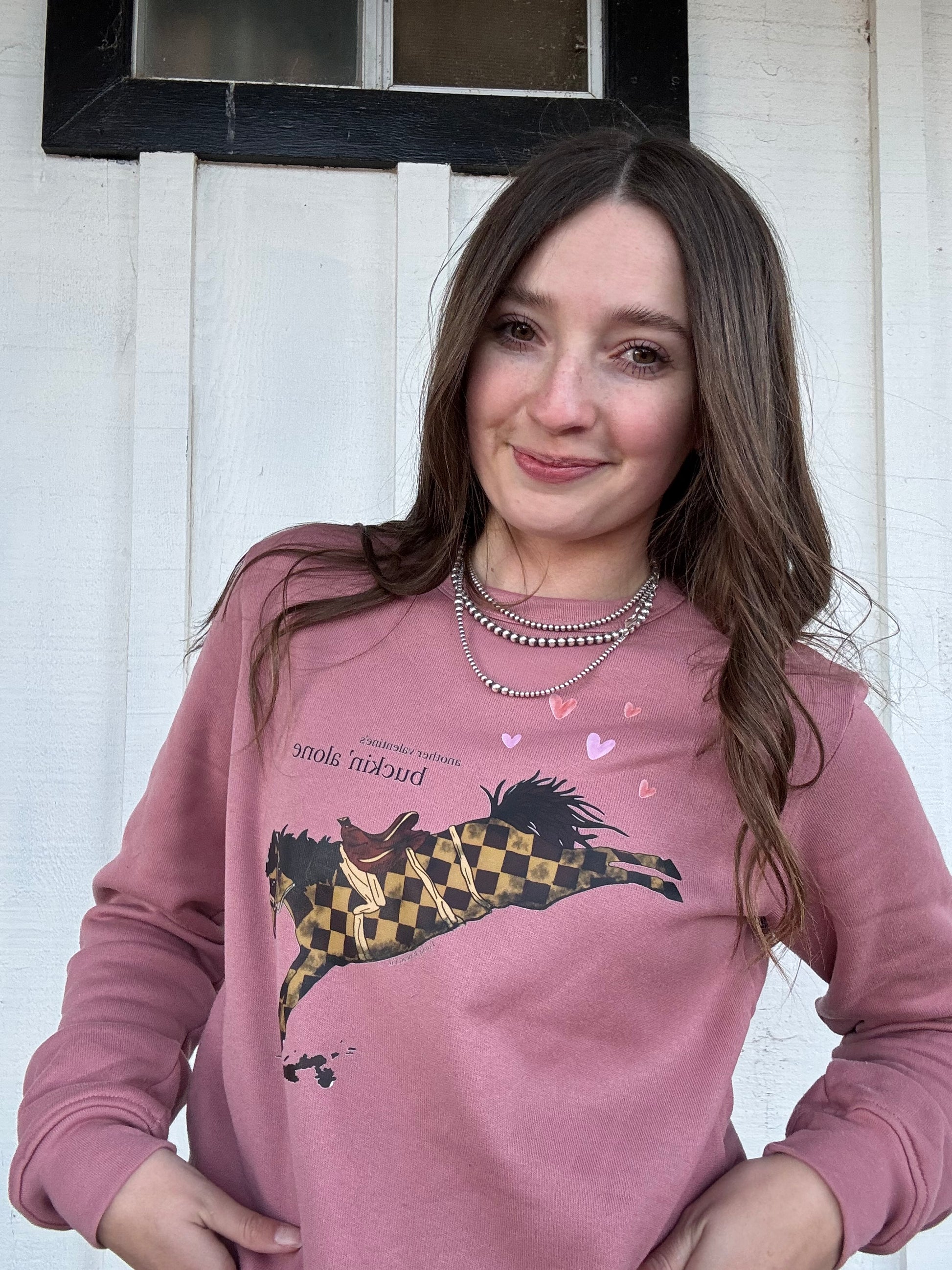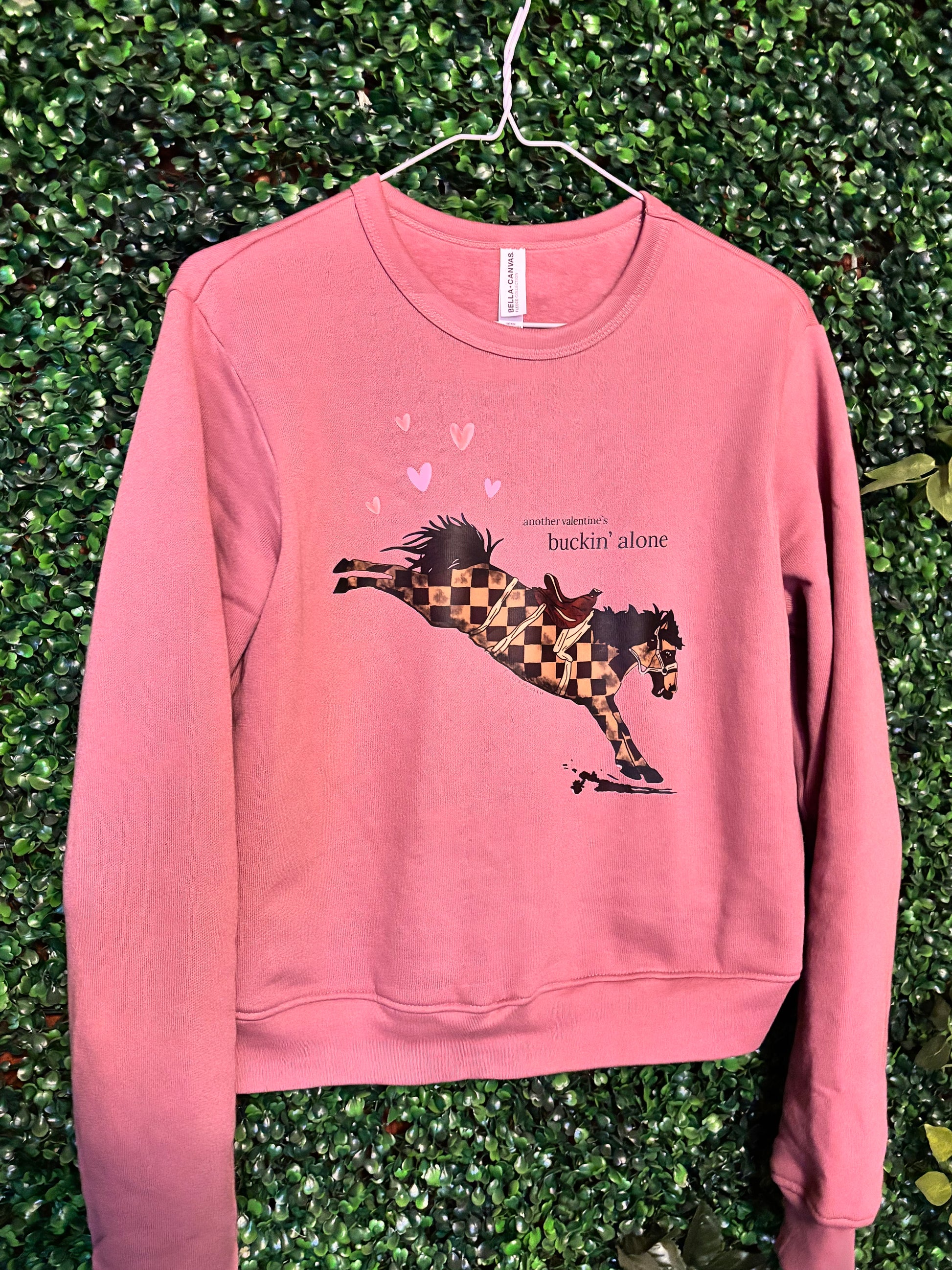 The Buckin’ Alone Crop Crewneck is for the girls who ride solo and wouldn’t have it any other way. Featuring a bold bucking horse graphic with playful heart details, this design is equal parts western grit and Valentine sass.
