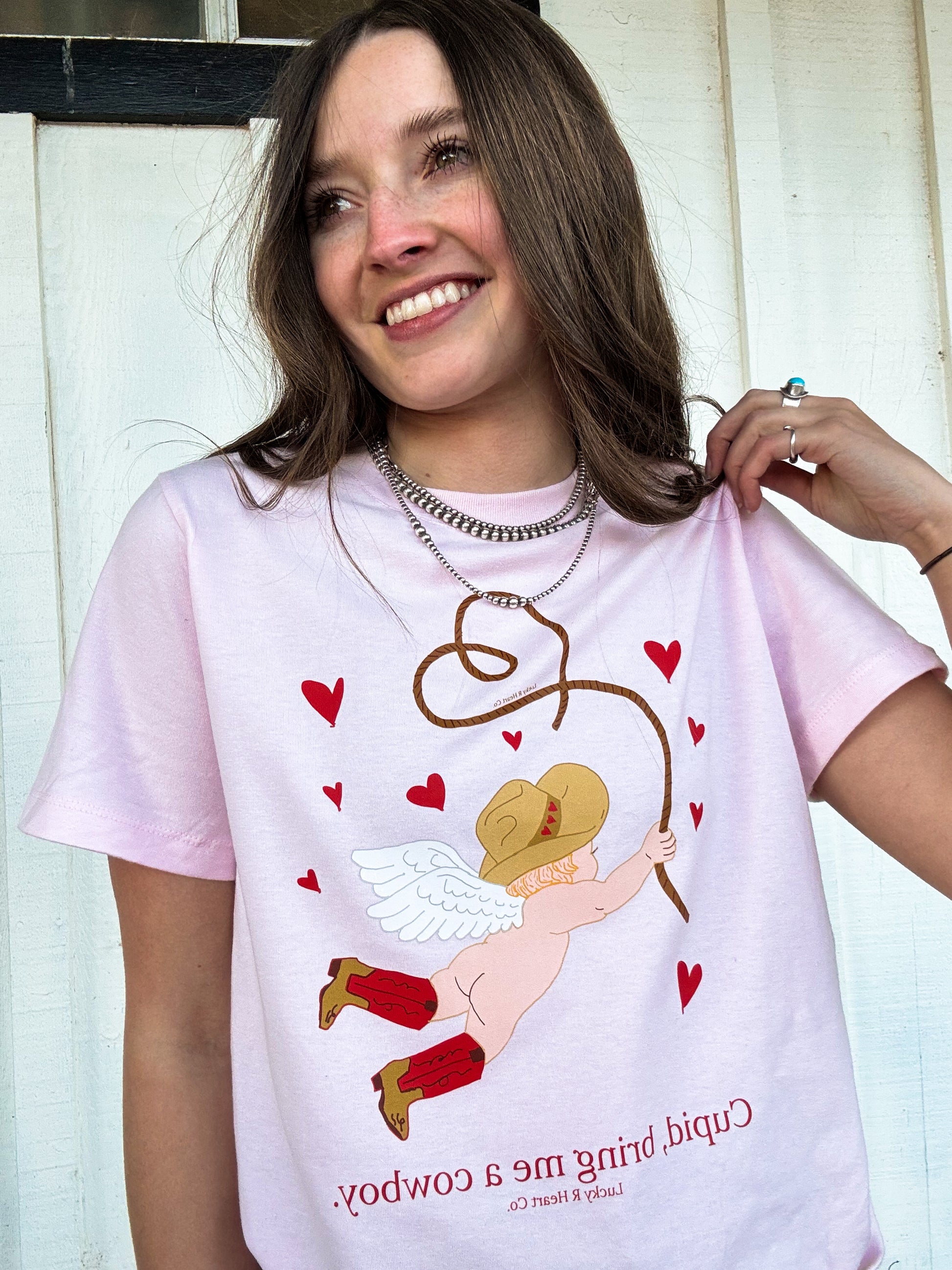 The Catchin’ a Cowboy Tee features a fun, whimsical cupid ropin’ hearts in true cowboy fashion. Sweet, playful, and full of charm, this design is perfect for anyone who believes love’s best caught with a lasso and a good hat.