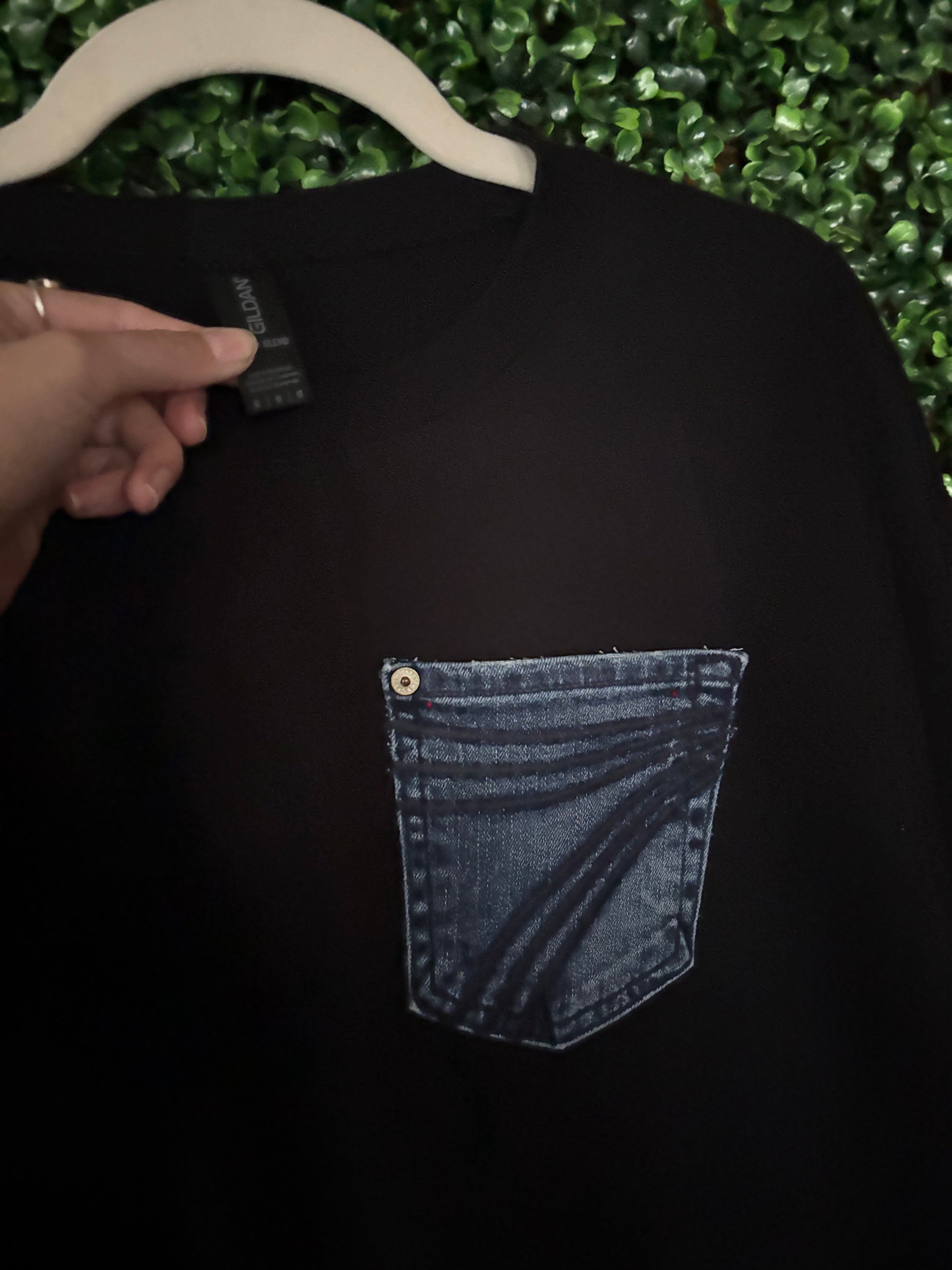 These pink denim-pocket up-cycled sweatshirts are LIVE NOW on the Lucky R Heart Co. site.