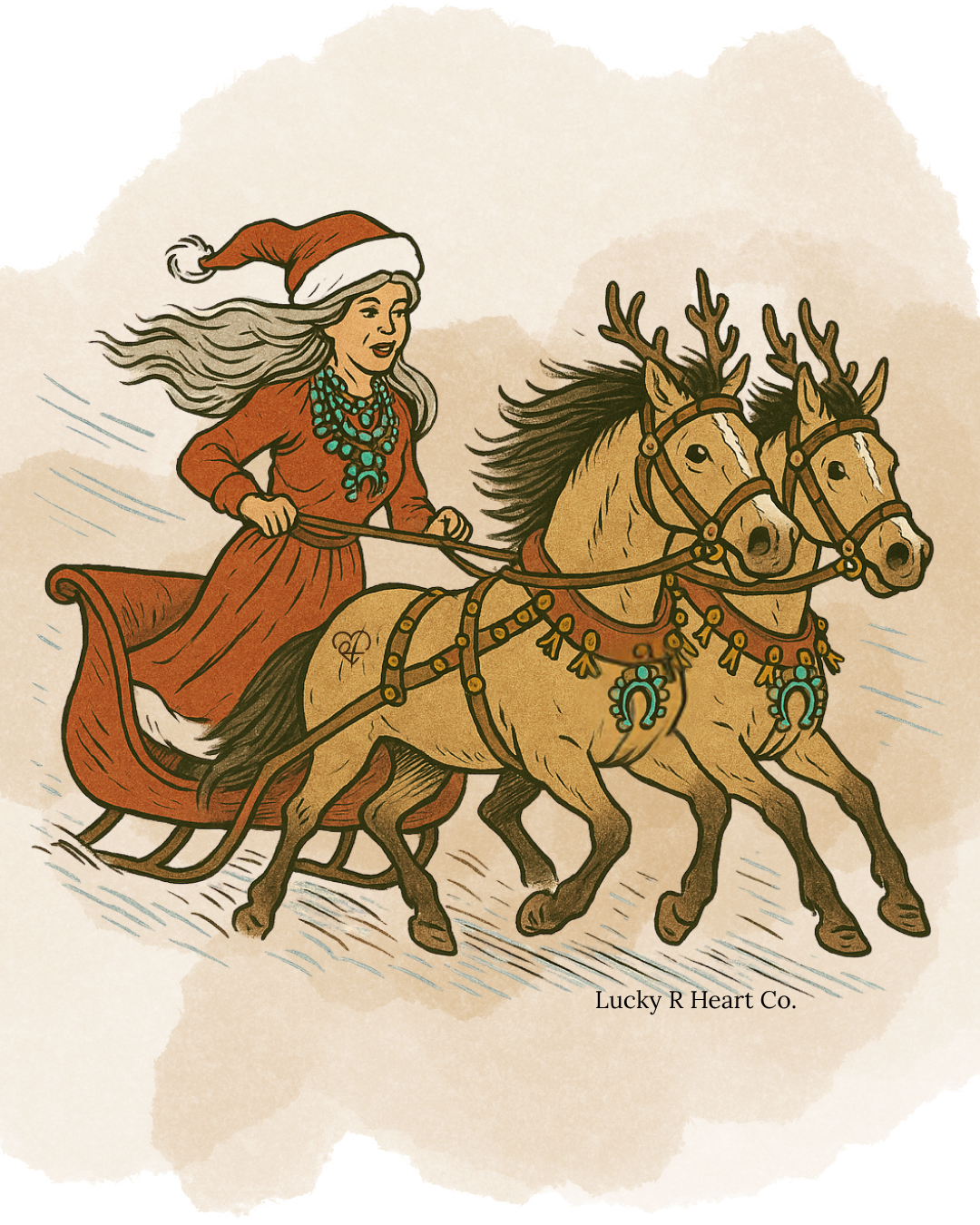 Drawn in our signature old-west illustration style, every detail, from her flowing hair and squash blossom necklace to the branded sleigh and R-Heart reins captures that perfect mix of rustic charm and festive spirit.